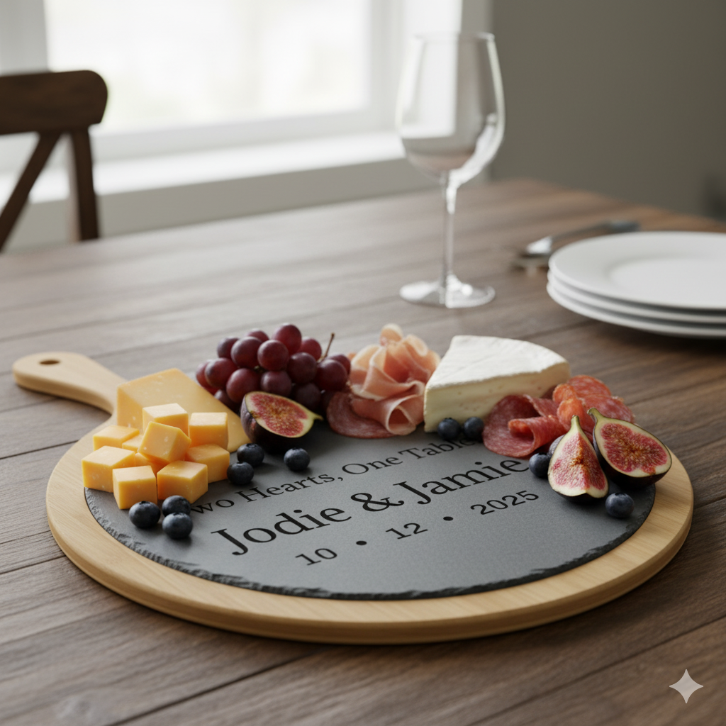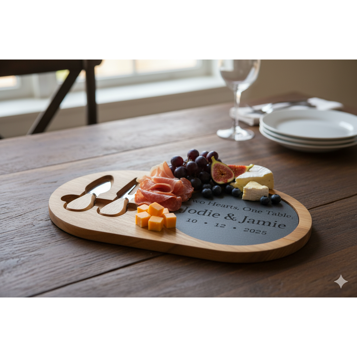 Elevate your entertaining with this exquisite Charcuterie Board. Crafted from durable acacia wood and featuring a removable slate surface, it's perfect for showcasing your culinary creations. The engraved design adds a personalized touch, making it not just a serving piece, but a conversation starter. Imagine hosting gatherings with friends and family, the board becoming the centerpiece of laughter and delightful feasts. Ideal for culinary enthusiasts and those who cherish shared moments, this board is also a thoughtful gift for weddings, anniversaries, and housewarming celebrations. Celebrate love, friendship, and festive occasions with this charming piece that embodies warmth and joy.