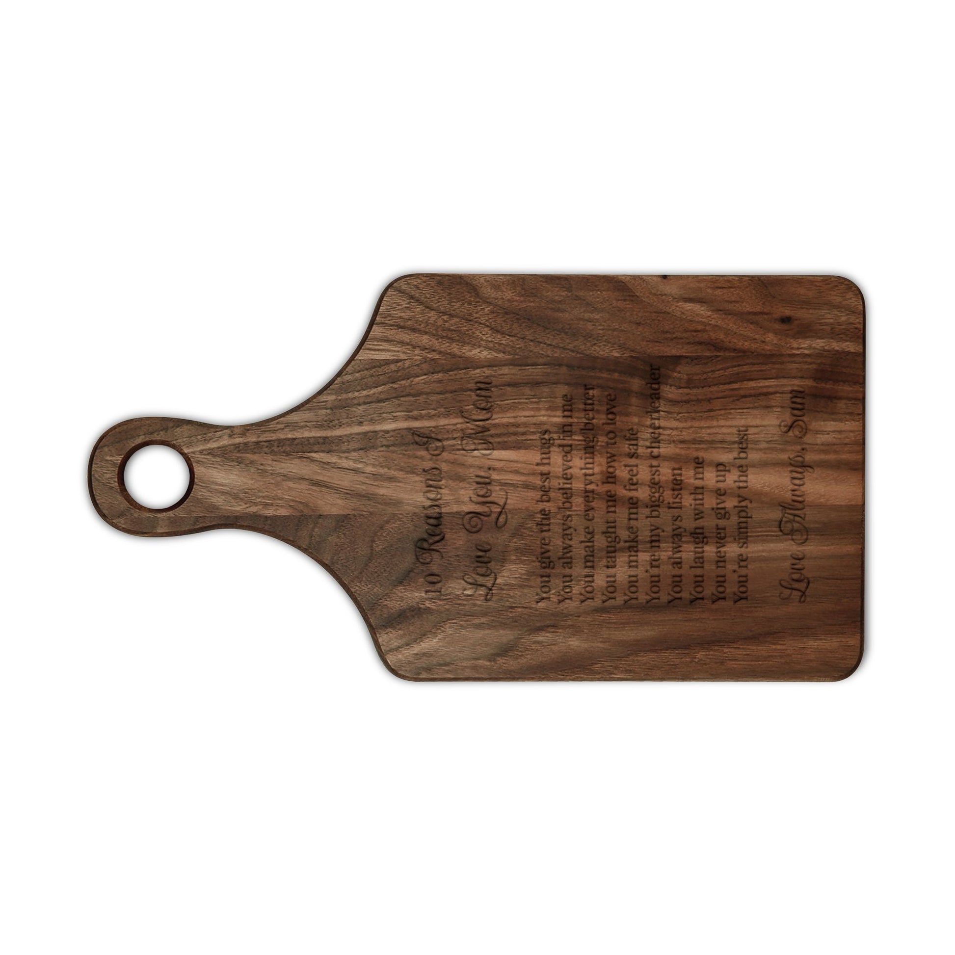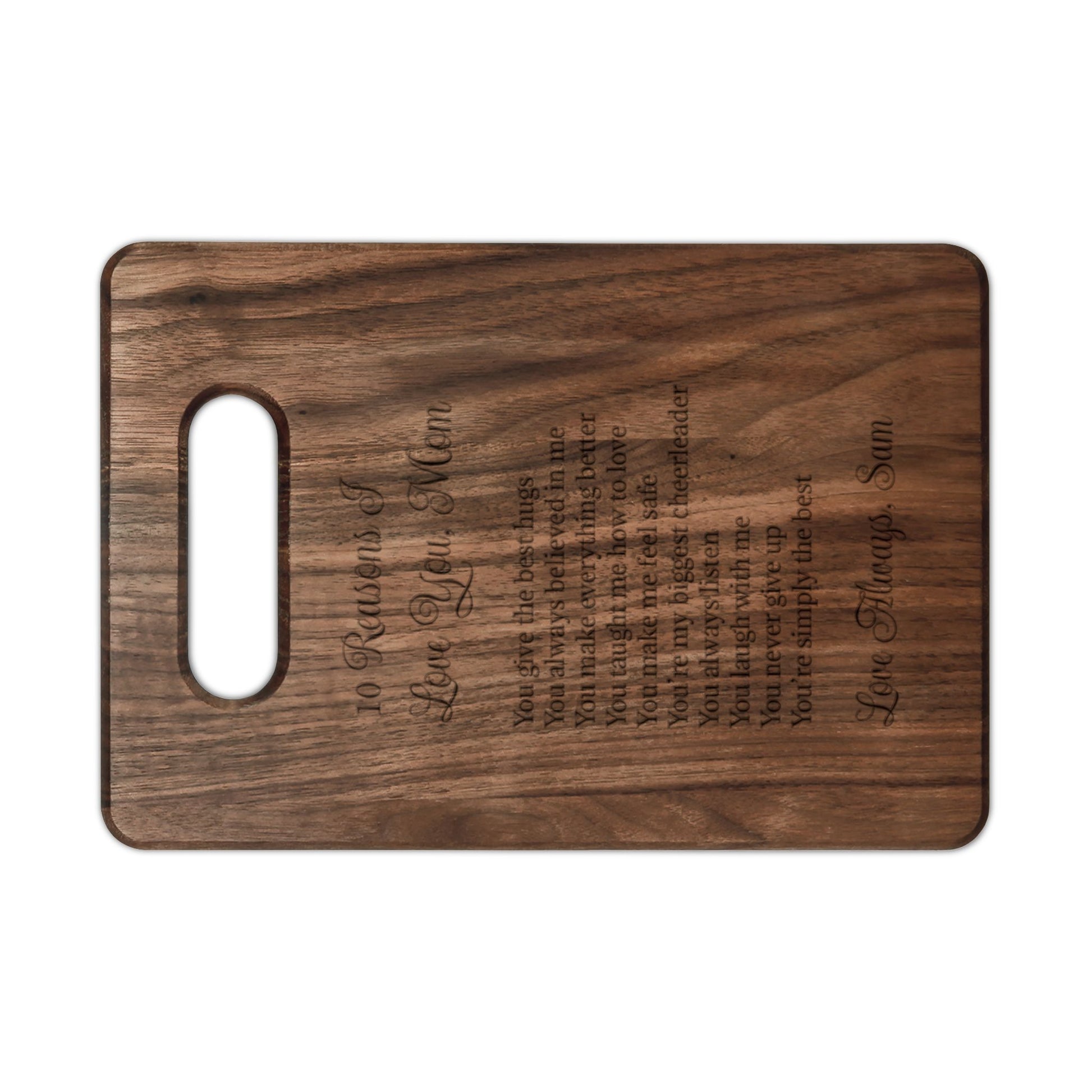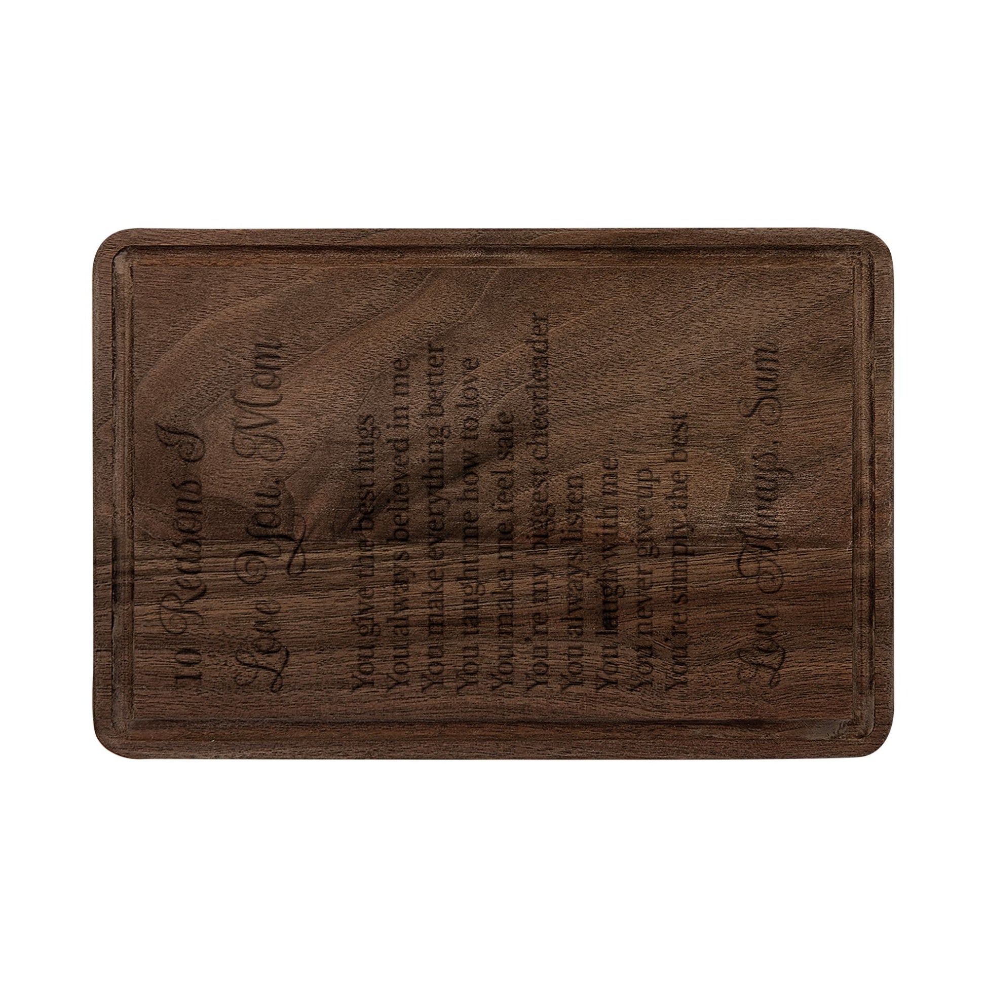 This engraved wooden cutting board is designed around your “10 Reasons” — a deeply personal list that turns everyday words into something lasting. Each reason is carefully etched into the wood, creating a piece that feels intimate, thoughtful, and impossible to replace.