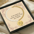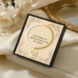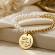 Pearl and gold bracelet with a commemorative charm on a decorative card.