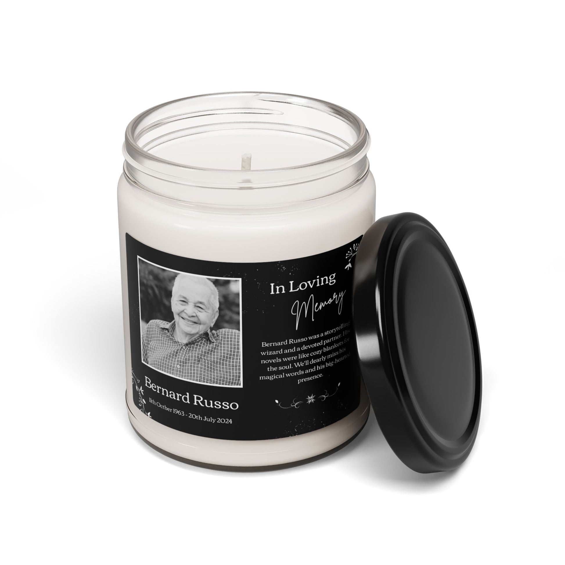 Honor a life well lived with The Memorial Scented Soy Candle – a personalized memorial candle featuring your loved one’s photo, name, dates, and a heartfelt message.