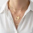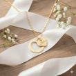 A delicate heart-cutout necklace with a small engraved heart pendant suspended inside a slim open circle. Lightweight and polished, it catches light with subtle movement — the engraved heart adds a quiet personal touch without overpowering the design. Wear it layered or alone to let the little heart rest close to the collarbone, bringing a soft, intimate accent to everyday outfits or more dressed-up moments.